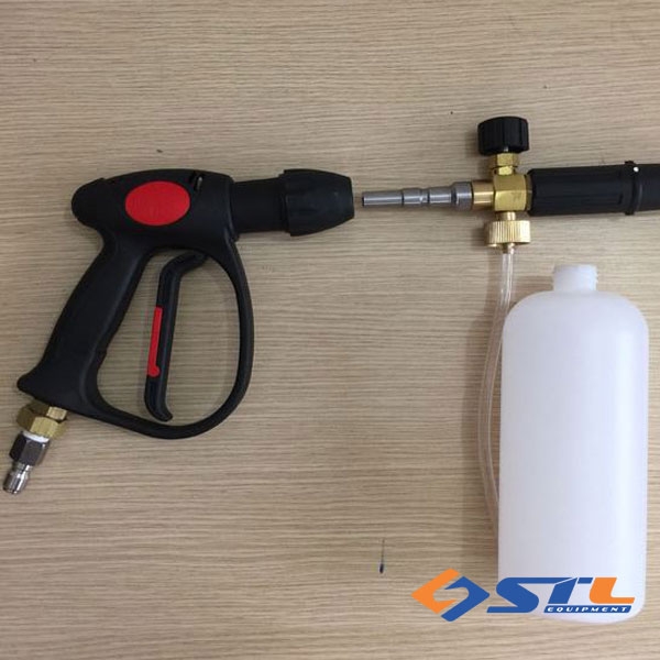 Đầu súng là đầu nối nhanh ( đầu nối bi ), gắn trực tiếp vào máy rửa xe cao áp. Trên đỉnh súng có núm chỉnh để điều khiển lượng nước đi qua. Đầu phun bọt tuyết có thiết kế phun góc rộng, tia bọt mỏng để hóa chất phun đều trên bề mặt xe và tiết kiệm được hóa chất hơn so với bình bọt tuyết to.